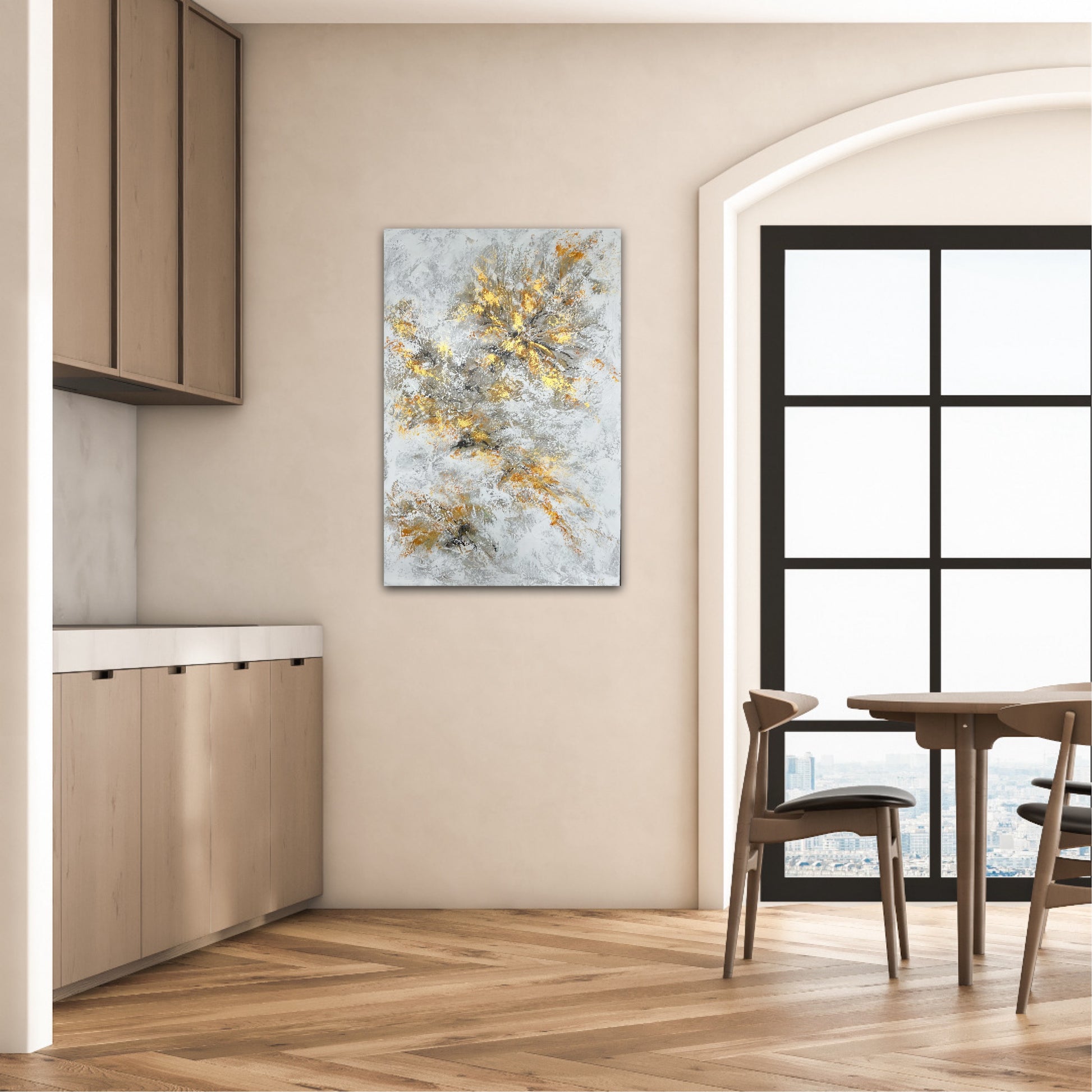 Šis darbas puikus pasirinkimas mažesnei sienai arba kabinti virš kokio nors baldo. Šiltos spalvos ir saikingas aukso blizgesys suteiks erdvei lengvos prabangos ir modernumo. Paveikslas vienetinis, tapytas akrilu ant drobės. Paveikslas paruoštas kabinti, gale pritvirtintas troselis.
